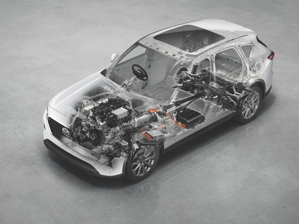 The CX-60 offers a versatile lineup of powertrains, all paired with an eight-speed automatic transmission and Mazda’s i-Activ all-wheel-drive (AWD) system for confident handling. The star is the PHEV variant: a 2.5-liter four-cylinder petrol engine (181 HP/261Nm) combined with a 100kW electric motor and 17.8kWh battery, delivering a total of 323 Hp and 500 Nm of torque. This setup accelerates from 0-100km/h in about 5.8 seconds, offers up to 62km of electric-only range, and boasts impressive fuel efficiency—around 47km/L in hybrid mode.
